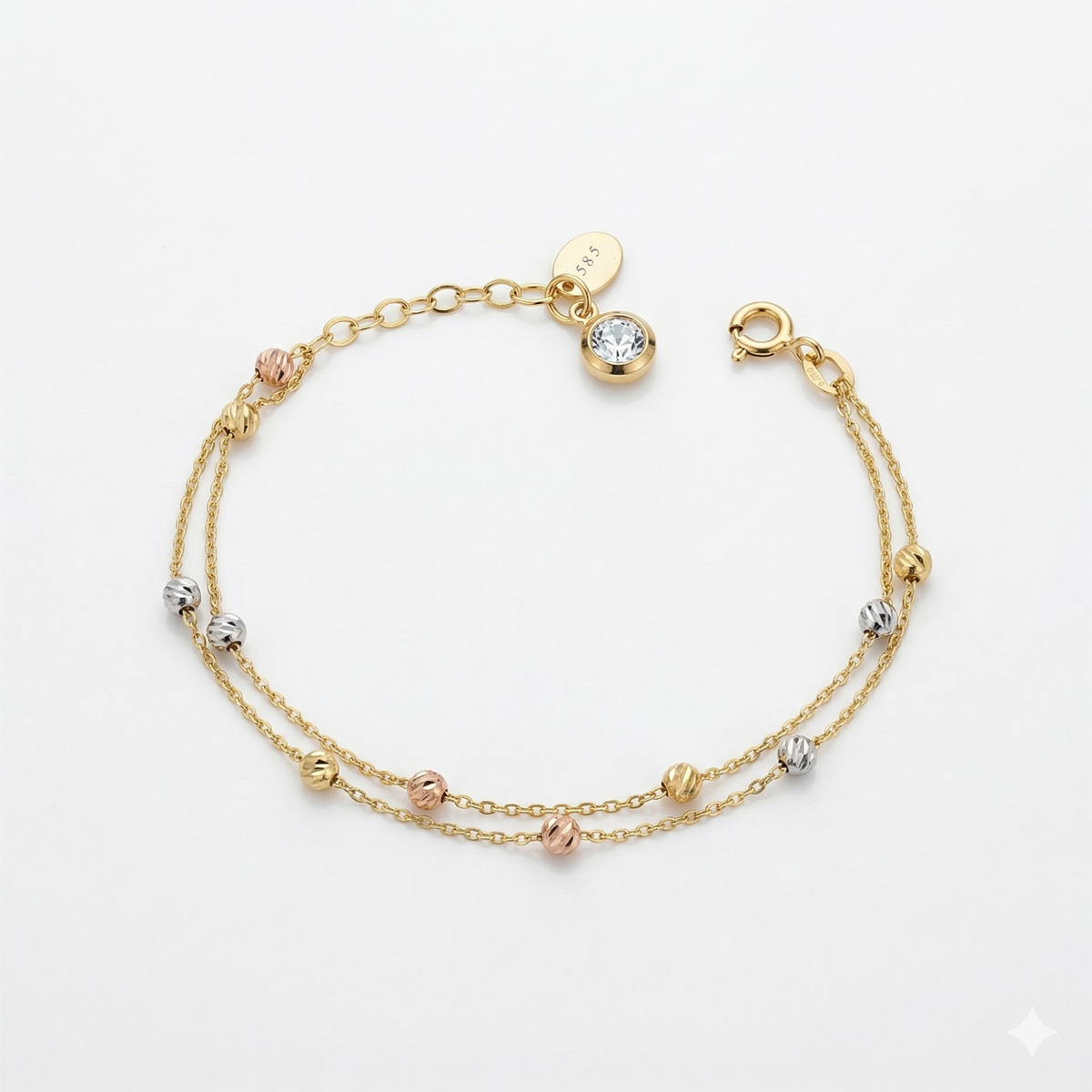 Gerçek 14 ayar altından titizlikle üretilen bu ikili Dorika toplu bileklik, çift zincirli yapısı ve hareketli Dorika toplarıyla bileğinizde zengin bir duruş sergiler.